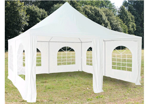 Stabiles Stecksystem mit PVC Planen, Sprossenfenstern und 4 Eingängen.